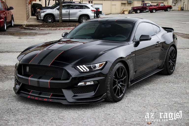 For this Mustang the customer chose 50% tinted carbon fiber from our carbon vibes line. To us, this is the closest one can get to a real “wet” look carbon fiber without the texture. The customer also requested a 1/4″ red stripe on either side of the stripe to finish off the look and tie into the other accessories on the car.