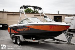 Here is a recent partial wrap install of a local MasterCraft boat. We did the custom design featuring bright orange