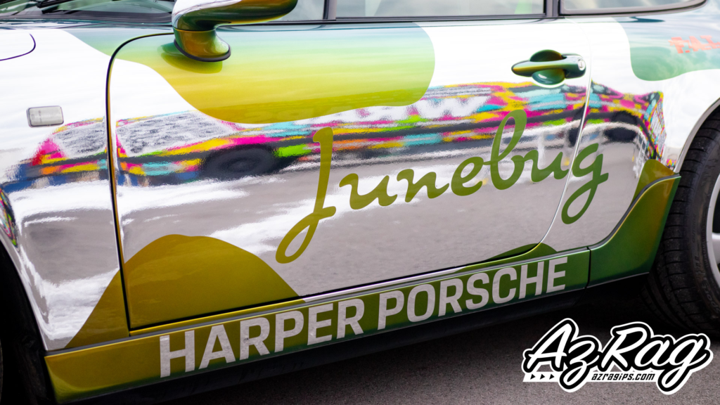 A chrome overlay is exactly what it sounds like: we apply a chrome film as a graphic element (not necessarily full coverage), then build the livery around it so the design feels intentional rather than “stuck on.” On Junebug, the chrome wasn’t used to replace the paint—it was used to frame it.