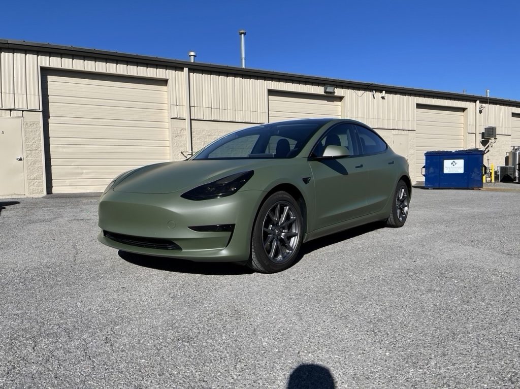 This Tesla 3 is fully wrapped in 3M’s 2080 Matte Military Green film. Couple that with a gloss black chrome delete and you have a unique look that sets you apart from all other vehicles on the road. What color combinations can we come up with for your personal vehicle?[INSERT_ELEMENTOR id=”5275″]